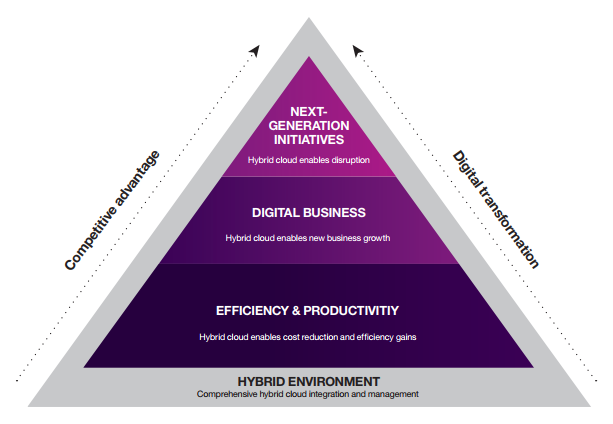 - Frontrunners: are gaining a competitive advantage through hybrid cloud and are managing their environment in an integrated, comprehensive fashion for high visibility and control (as an example, through a single data-driven dashboard).